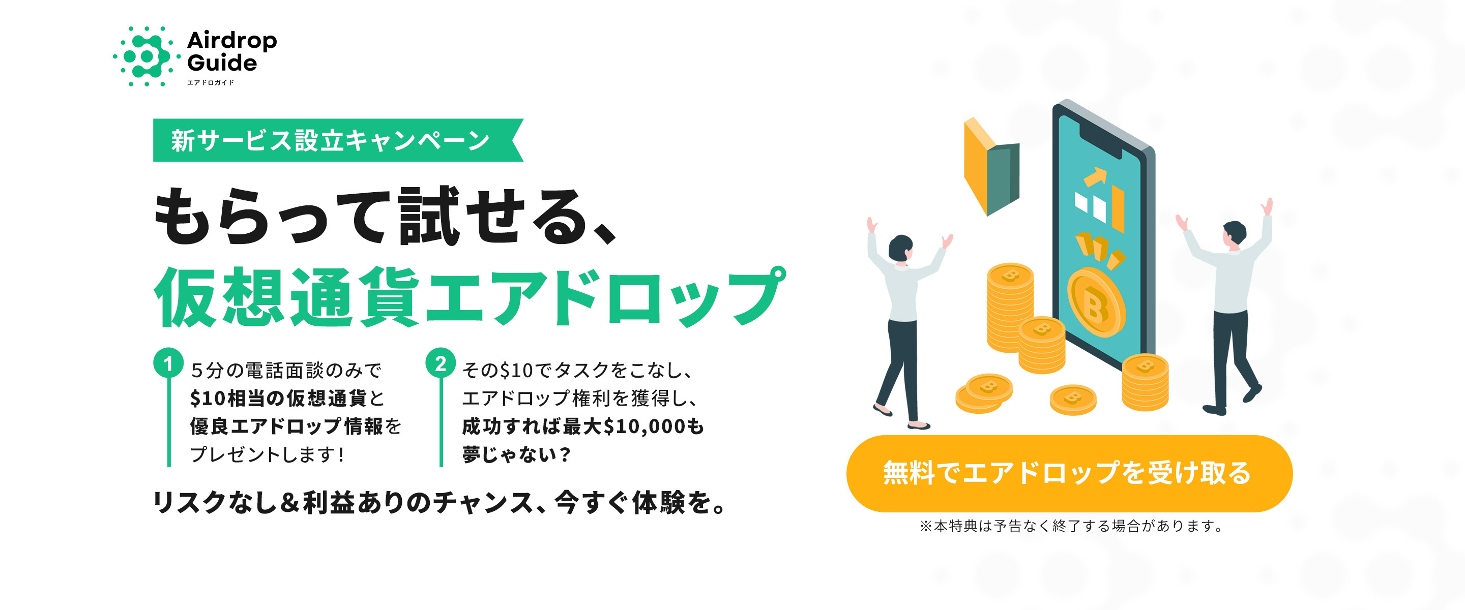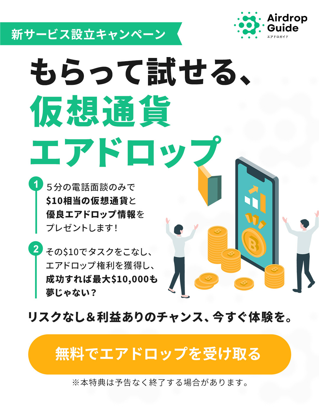 5分の電話面談のみで$10相当の仮想通貨と優良エアドロップ情報をプレゼントします!